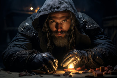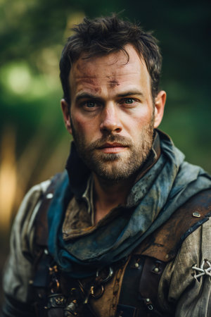 Portrait of a medieval warrior with a beard in a leather jacket