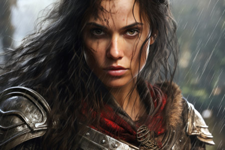 a woman in armor with wet hair
