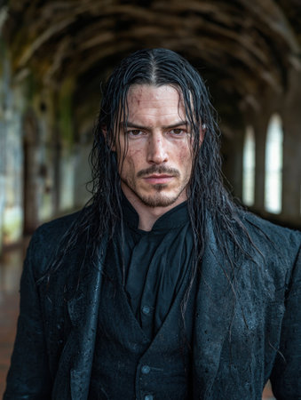 Mysterious man with long dark hair in a dark tunnel