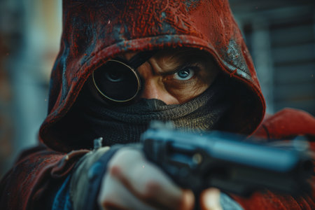 A cloaked individual holds a gun steady, their masked face and piercing gaze conveying urgency amidst a robbery scenario in an urban area