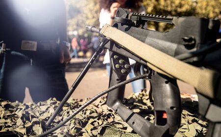Paris, France - Sep 21, 2019: Detail of semi-automatic rifle manufactured by German Heckler and Koch GmbH - military pattern background