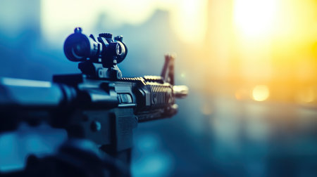 Detailed View of Assault Rifle Against City Rooftop Backdrop
