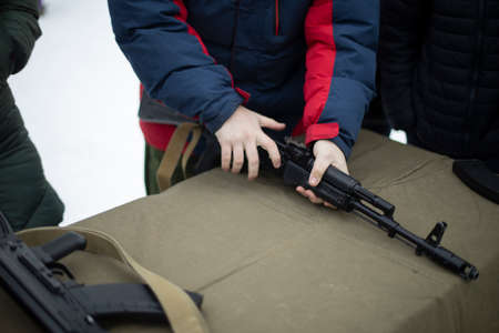 Children learn to shoot in Russia. Assembly of automatic weapons. Lesson in military training. Details of war training. Hands hold barrel of machine gun.