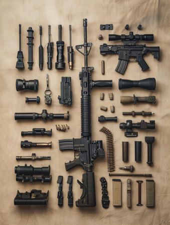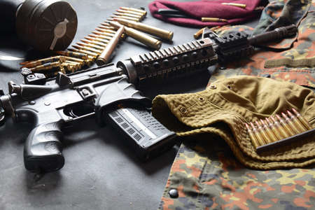 Assault rifle, assault rifle and other military equipment on brown background
