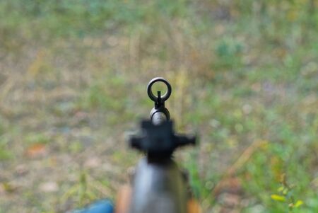 part of a black rifle with a metal sight in hand