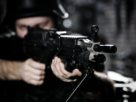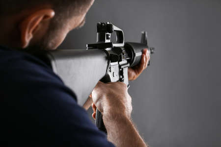 Assault gun. Man aiming rifle on dark background, closeup