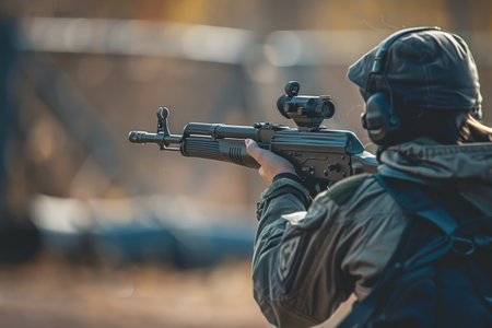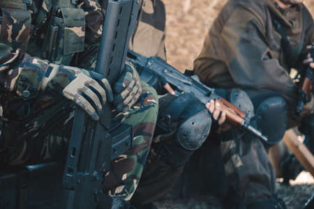 Shooter aiming target with assault rifle weapon. Dangerous bandit aiming gun. Special soldier during the military operation mountain road. Selective focus