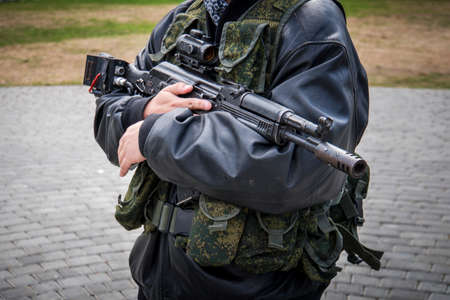 a man with a machine gun. male men's hands holding a rifle.