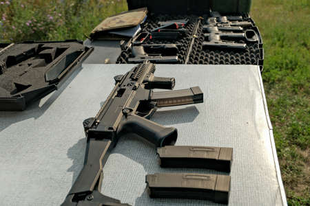 Firearms for training. The machine is on the table. Reliable small arms. Details of military training.