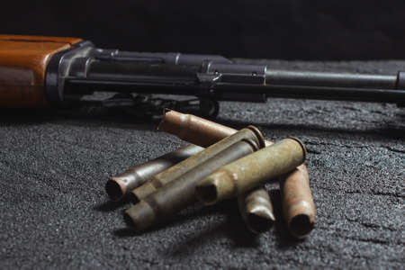old rusty spent cartridges and a gun barrel on black concrete