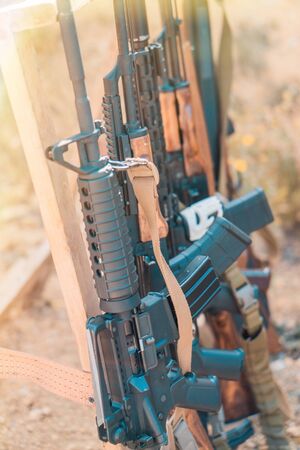 Carabiners and rifles at the shooting range. Concept for shooting school, shooting courses and safe handling of weapons. Soft focus.