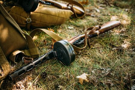 Soviet russian military ammunition - submachine gun of World War II on ground.