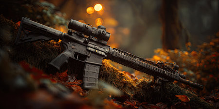 A detailed image displays a modern rifle featuring a scope, resting on a bed of foliage. The composition showcases a dark, textured style with warm tones and soft lighting. The setting suggests an outdoor environment, possibly a forest, implying a potential use for tactical or educational content.