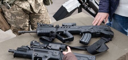 Kyiv, Ukraine - 6 october 2019 : Military festival in Kiev. military ammunition for the soldiers of the Ukrainian army. Contract Army in Ukraine
