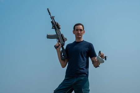 Caucasian man shot down a drone with a shot from a rifle.