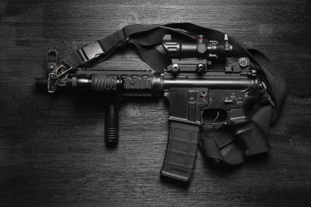 Close up photo of M16 rifle on wooden board