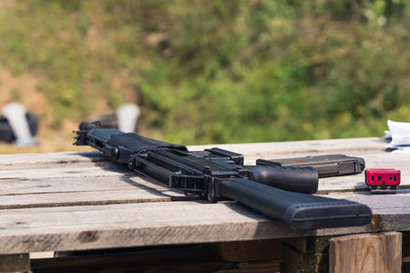 Unused black shotgun placed on a wooden table. Outdoor shot. Day at a shooting range concept. Unconventional hobby. High quality photo