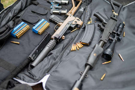 Cartridges Pistol. The gun is next to the cartridges. Weapon Suitcase for the gun. Buying weapons. Cartridges of different calibers next to the gun. Weapons storage. Collectible