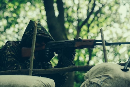 insurgent sniper with SVD rifle the aiming in forest