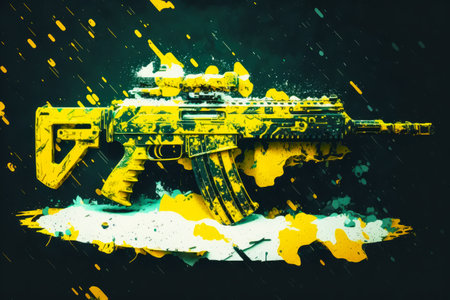 Yellow and black paint splattered rifle on black background with yellow spots. Generative AI.
