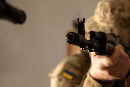 A Ukrainian soldier in military uniform holds a machine gun, the war in Ukraine and the protection of his home and family 2022