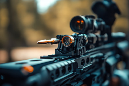 A close-up view of a tactical rifle showing a round in the chamber and advanced optics in a natural setting.