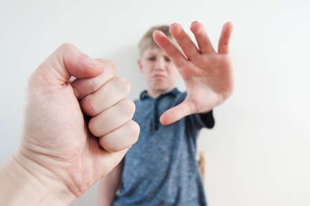 Aggression in the family, man beating up his wife. Domestic violence concept.