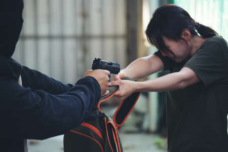 Thief armed man rob woman by gun on street so scared shocked face. Frightened asian woman was rob aggressive by danger bandit man. Robbery thief using gun burglar. Criminal aggression crime concept.