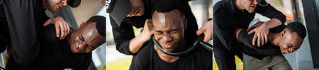 collage of policeman holding police baton near throat of scared african american man with closed eyes, racism concept