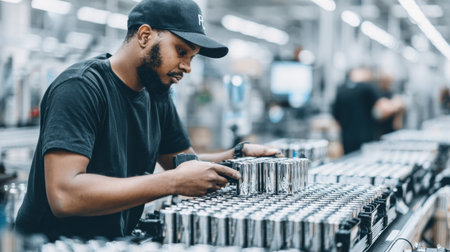 A focused worker examines metallic cans on a conveyor belt in a large production facility filled with activity during the daytime hours.