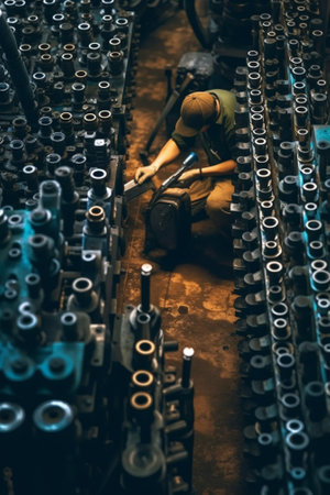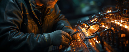 A skilled mechanic repairing machinery in a dark workshop generated by artificial intelligence