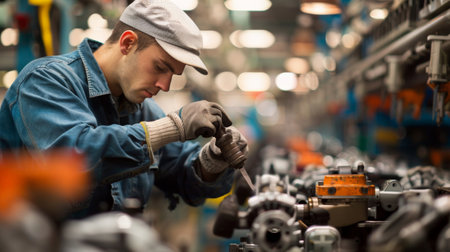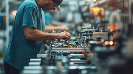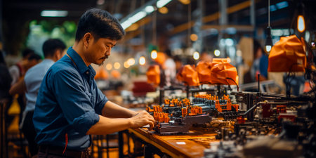 Indian mechanic concentrating on assembling engine parts on a production line in a bustling factory environment