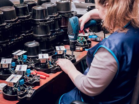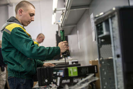 Saint-Petersburg, Russia - October 19, 2016: The production line of a small business computer assembly. Engineer a production line with a screwdriver in his hands