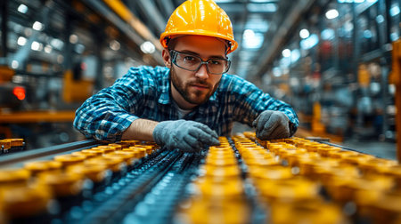 A factory worker in a hard hat and safety glasses, inspecting machinery on a production line in an industrial setting.
