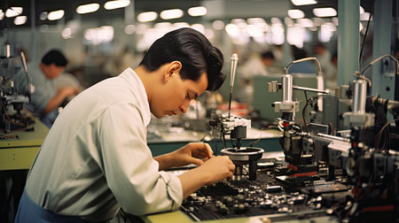 Assembling a computer is a meticulous process, with hands in the factory carefully positioning and fastening parts onto the motherboard with precision. Generative AI
