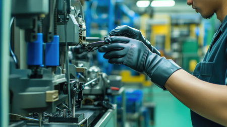An industrial worker operating machinery in a factory setting.