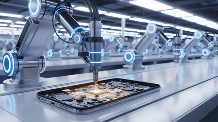 Robotic arms assembling an advanced smartphone circuit board on a modern production line