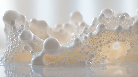 This image captures creamy white foam with bubbles in natural light, creating an abstract and smooth texture. Ideal for culinary and artistic projects.