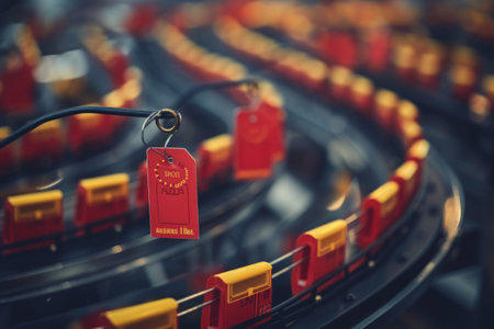 A straight line of luggage tags in attractive red and yellow colors, neatly arranged in a row, A chain reaction of price tags mechanism showing inflationary spiral, AI Generated