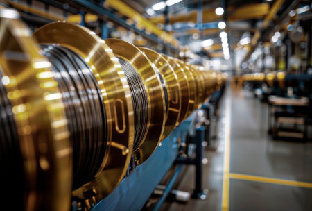 A close-up view of a modern manufacturing line highlighting shiny metal components in an industrial setting, showcasing innovation and efficiency in production processes.