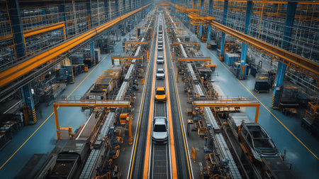 Overhead view of a streamlined car assembly line inside a contemporary vehicle factory, showcasing automation in automotive manufacturing.