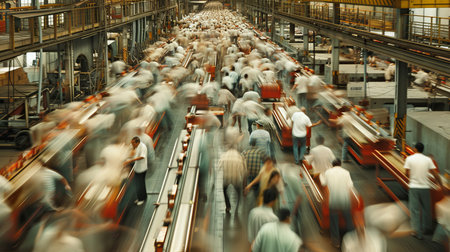 Large workforce at industrial factory assembly line demonstrates precision, teamwork, and technology in mass production of various products, emphasizing efficiency and organization