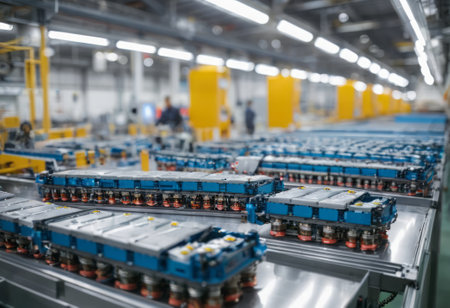 EV Battery Production Factory. Close-up of Lithium-ion High-voltage Battery Components for Electric Vehicle or Hybrid Car. Battery Module for Automotive Industry Production Line.