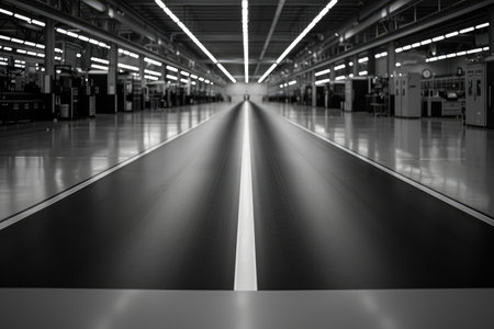A captivating view of a modern industrial warehouse showcasing machinery and a conveyor belt, emphasizing technology and efficiency in production.