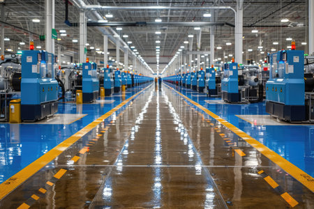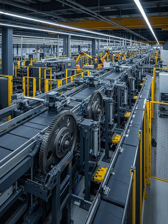 A long, organized assembly line stretches through a modern factory, showing automated machinery, conveyor belts, and workers engaged in production.