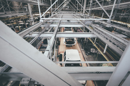 Photo of automobile production line. Welding car body. Modern car assembly plant. Auto industry. Interior of a high-tech factory, modern production