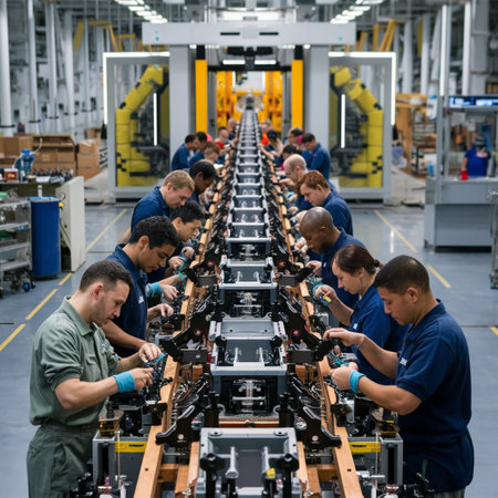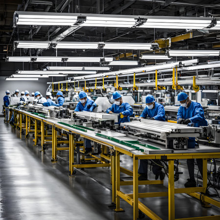 A long, organized assembly line stretches through a modern factory, showing automated machinery, conveyor belts, and workers engaged in production.