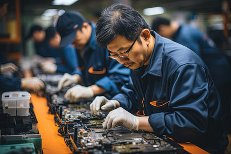 Factory workers collaborating in synchronized assembly and meticulous product inspection.