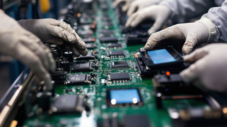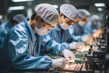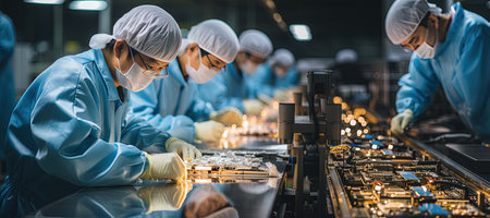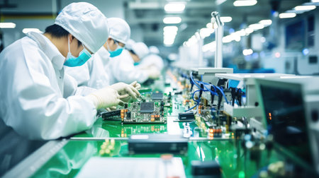 Assembly line workers in cleanroom attire assembling electronic components in a high-tech manufacturing facility