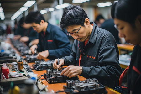 manufacturing process in a Chinese modern factory, including assembly lines, quality control, Generated with AI